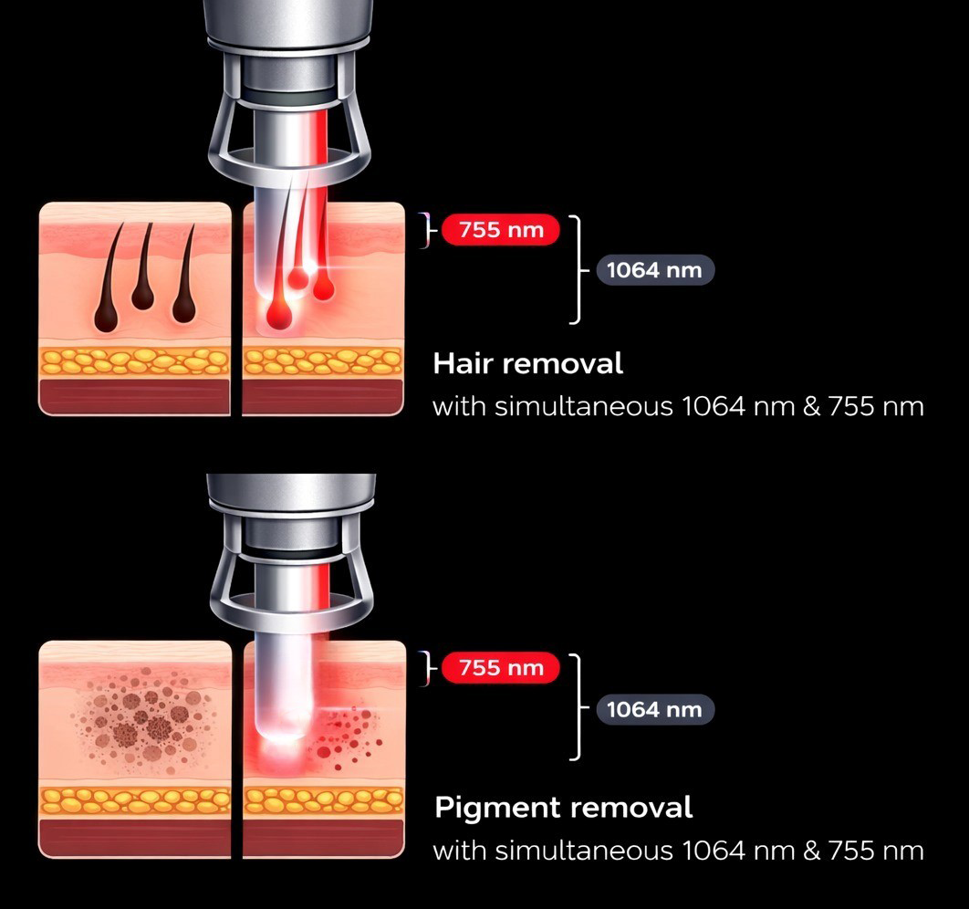 For instance, by emitting both 1064 nm and 755 nm simultaneously, physicians can perform hair removal treatments tailored to various hair types—whether thick or thin, black or grayish, and at different depths—offering a comprehensive solution. This adaptability extends to treating pigmented lesions, allowing the targeting of pigments located at varying depths.